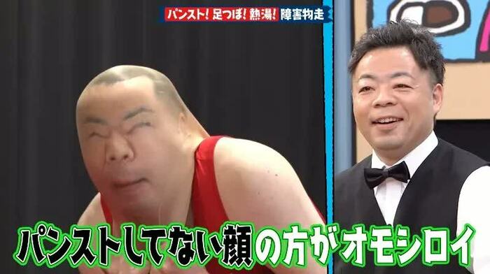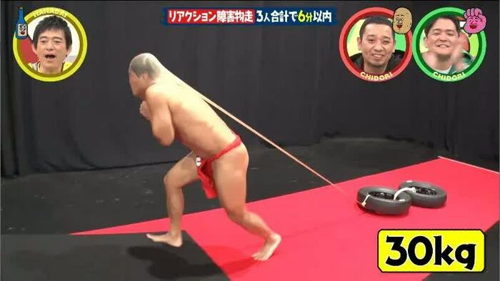 まずパンストにつながった30kgのタイヤを顔面で引っ張って進み、次に袋に足を入れた状態で足つぼマットの上を両足ジャンプ、最後は頭に熱湯を乗せたまま3台のハードルを越えるというもの。