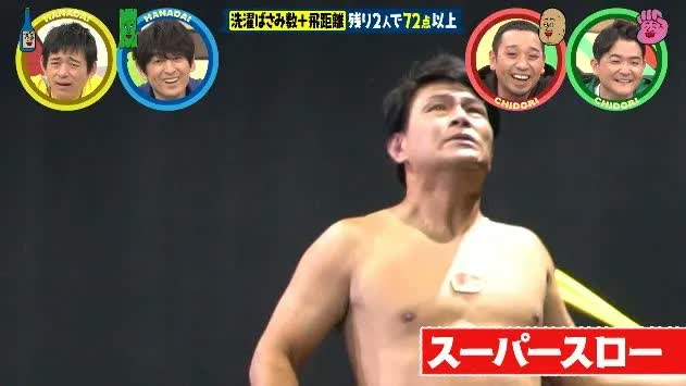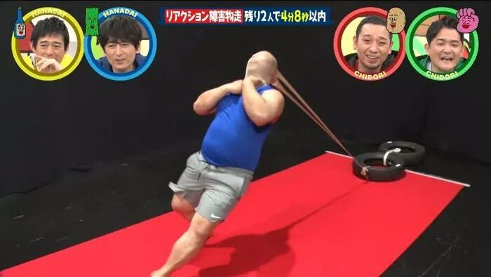 パンストをかぶってタイヤを引くも、頭が後ろに持っていかれて転倒。意外にも手こずり時間がかかった。熱湯ゾーンでは、頭上の熱湯をこぼさないように慎重に歩いたため、2分56秒とタイムは遅め。