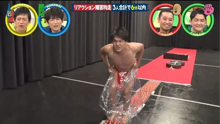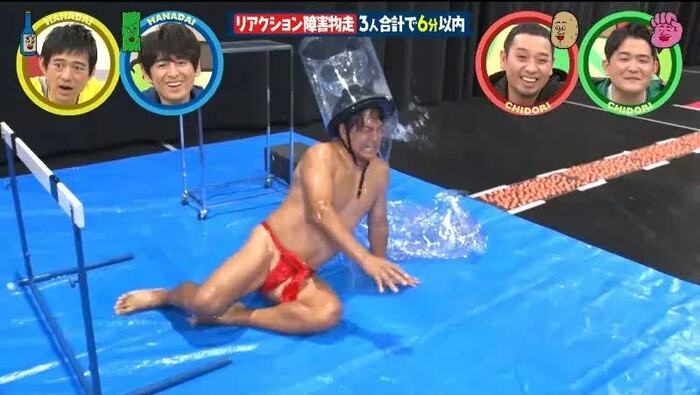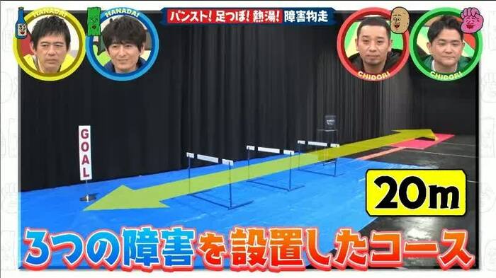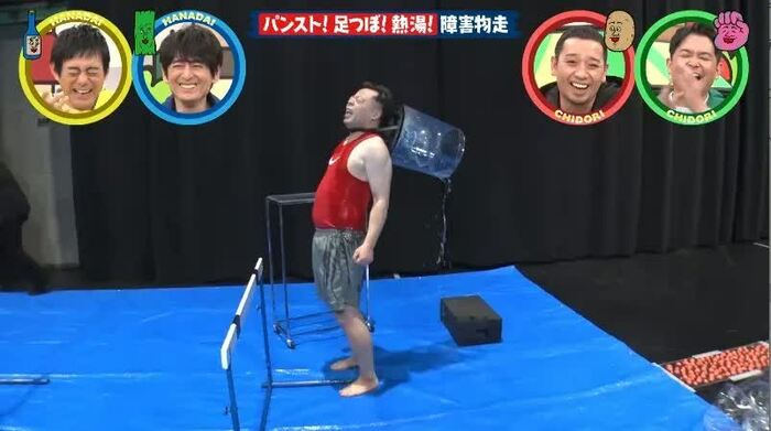 熱湯が入った容器を頭に乗せながらハードルを超えるゾーンでは、最初に頭に乗せた瞬間に熱湯をすべてこぼしてしまい、ゲームが台なしに。