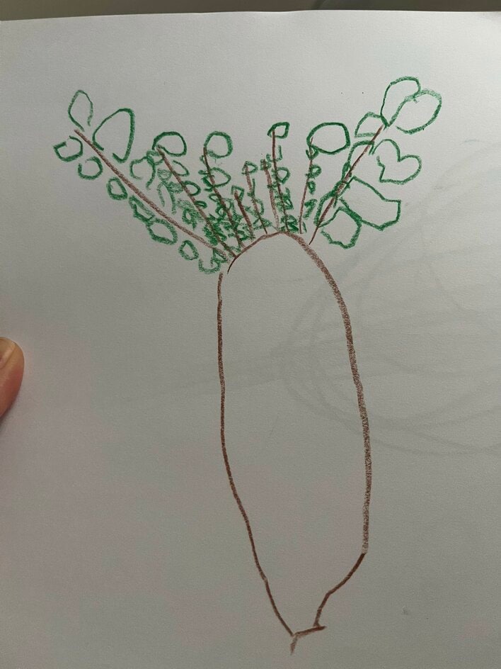 茶色のクレヨンで楕円のような形が描かれていて、その上には茶色の線が数本伸び、緑のクレヨンで小さな丸がたくさん描かれています。