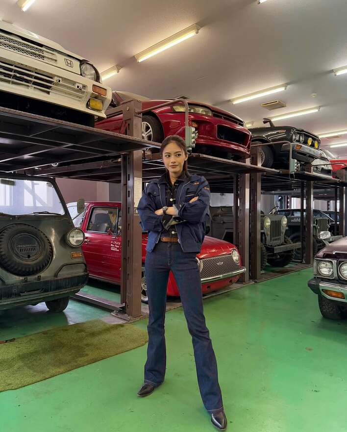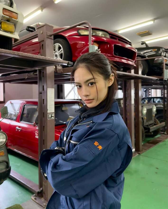 たくさんの車を背に、「安斉」と自身の名前が書かれたジャケットを羽織る安斉さん。凛々しい瞳で、こちらを見つめるクールな表情は見惚れてしまいます。