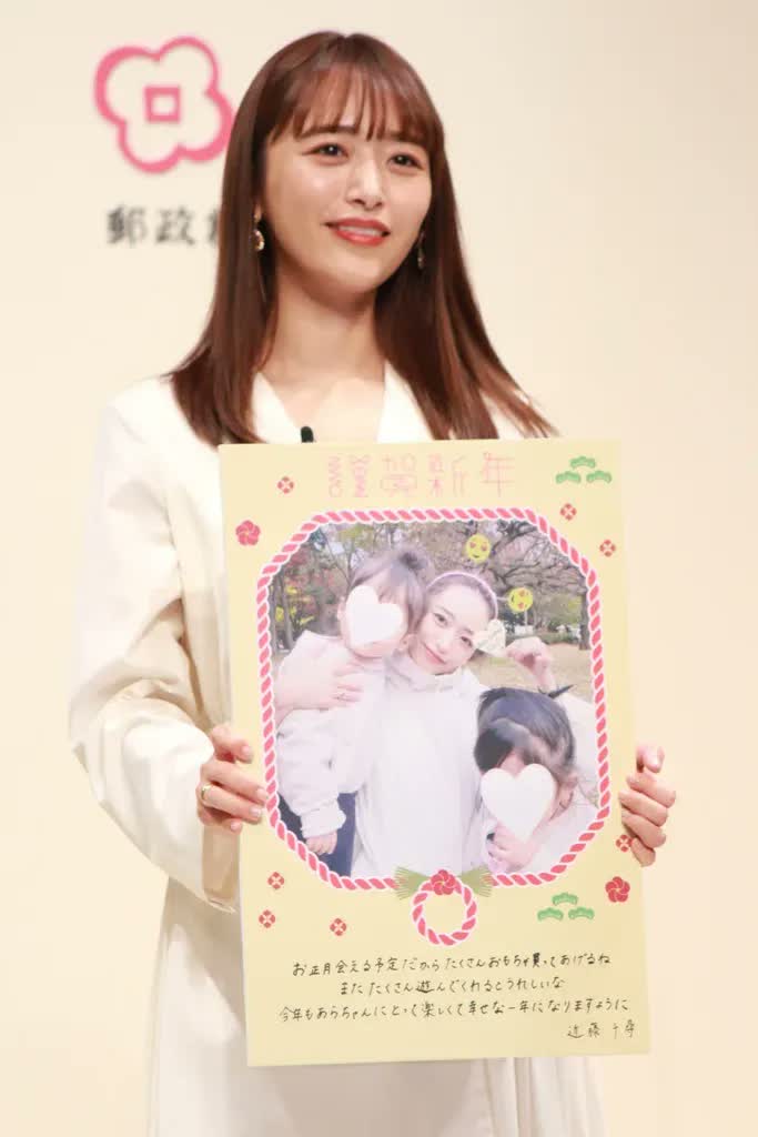 お笑いトリオのジャングルポケットの太田博久と結婚し、2019年には第2子を出産した近藤は、「(自分の)マネージャーの妹さんに年賀状を書きました。仕事に復帰する時に、不安でしょうがなかったんですけど、彼女のおかげで家庭と仕事と育児を両立できていると言えるので、彼女のことを思い浮かべながら、撮影中は年賀状にシールを貼ったり、普段言えない言葉を送ったりして、世界に一つだけの年賀状を作りました」と明かした。