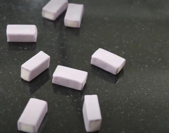 ハイチュウのブドウ味を使います。おなじみの長方形ブロックですが…