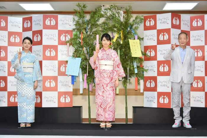 10月16日(金)公開予定の映画「みをつくし料理帖」の七夕記者会見が、7月7日に東京・銀座の東映本社で行われ、主演の松本穂香、共演の奈緒、角川春樹監督が出席した。