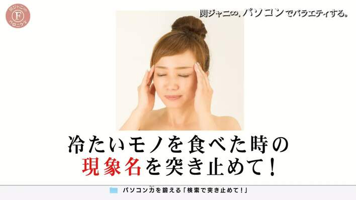 すると横山から「“頭”を先に入れたほうがよくない?」と提案され、せっかく入力した「つめたい」を消して「あたま」と入力し直し。「いや一緒やねん。順番関係ない」と大倉からツッコミが入るも「一応Googleさんにもやりやすさが出てくるから」と検索サイトに対する優しさを発揮する横山。結果「頭 冷たい キーン」で検索をかけ「アイスクリーム頭痛」という正解を導き出した。