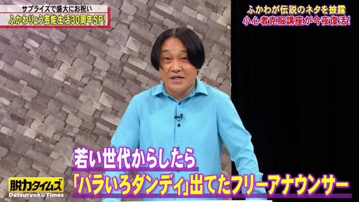 永野:ふかわさんといえば「小心者克服講座」。……若い世代からしたら『バラいろダンディ』に出てたフリーアナウンサーっていうイメージがあって。『バラダン』干されたから、幅広げるためにチャレンジしてるんだろうな、みたいに思ってる方も多いと思うんですけど。