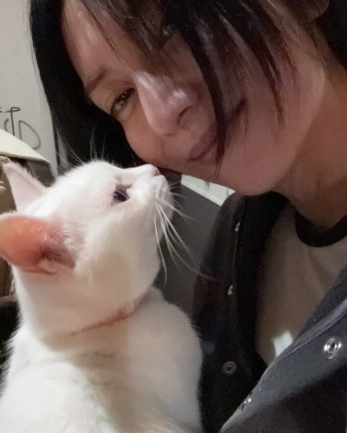真っ白な猫と顔を寄せ合った柴咲さん。柔らかな笑みで、幸せそうな表情を見せています。