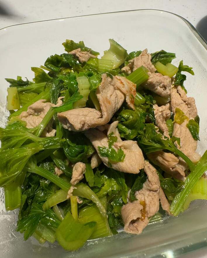 まずは、葉物野菜と豚肉の炒め物。