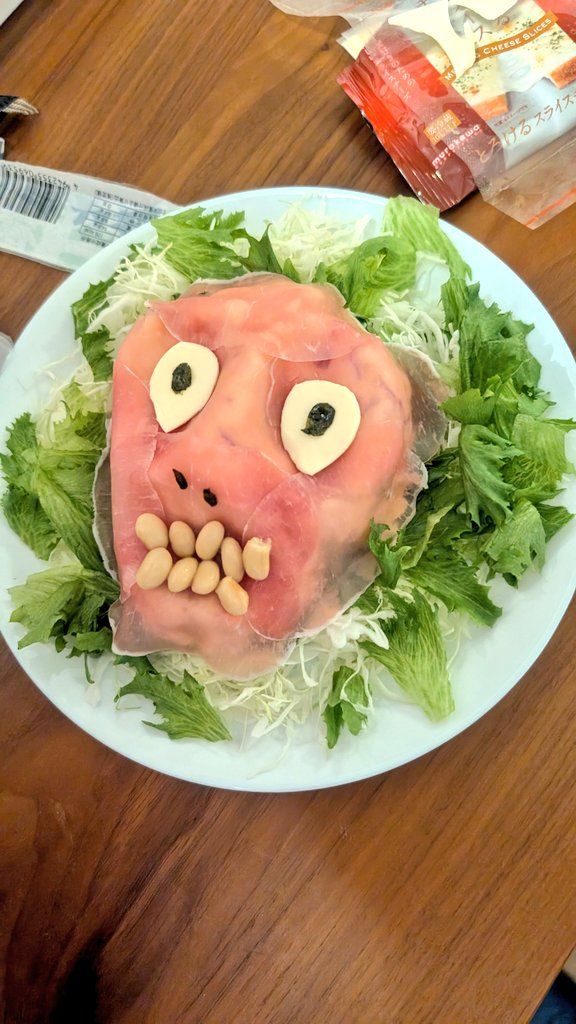 生ハムなどで不気味な顔面を表現したサラダも友人と一緒に作ったんだそう!