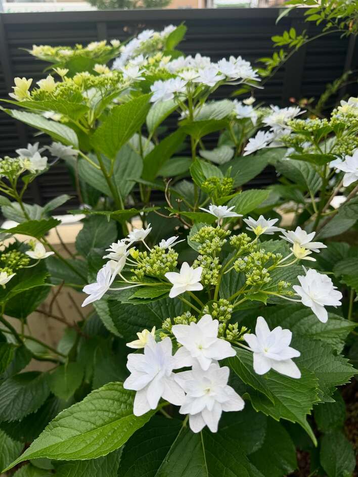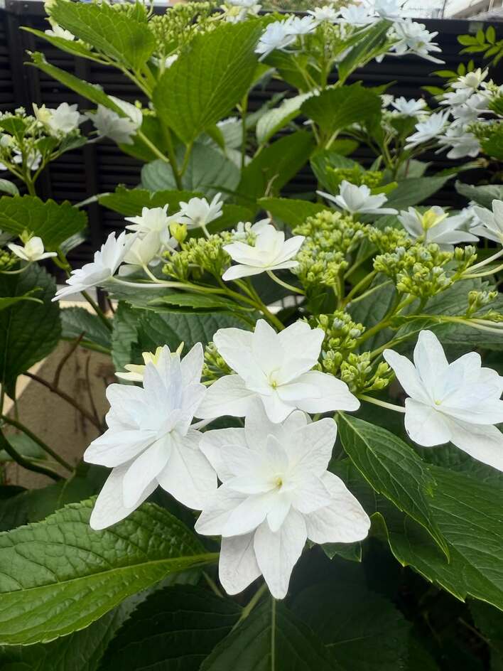 そこには、鮮やかに咲く白色の紫陽花が。青々とした葉っぱの間から顔を出す 真っ白い紫陽花がとてもキレイです。