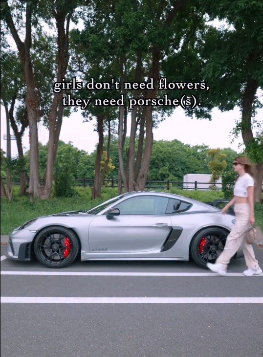 今回の投稿では、「4月に納車しました!」というコメントとともに動画を投稿!映像には、「girls don't need flowers, they need porsche(s)」(女の子に花はいらない、必要なのはポルシェ)との“車愛”あふれる一文が記され、路肩にシルバーのポルシェが停められています。