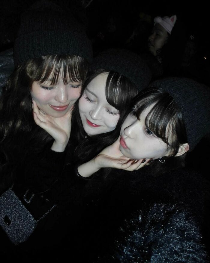 全身ブラックで超ミニ丈のスカートのシミラールックの3人。