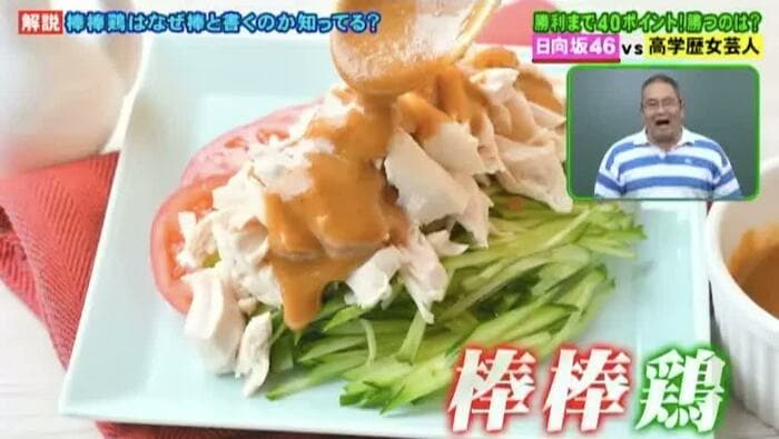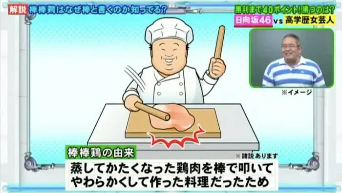 「炸醤麺(ジャージャーメン)」や「雲呑(ワンタン)」、「油淋鶏(ユーリンチー)」など、中華料理のメニューの読みを問う問題では、「棒棒鶏(バンバンジー)」になぜ「棒」の字が使われるのか、地理の村瀬哲史先生が教えてくれた。