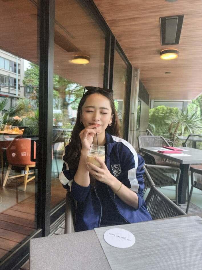 カフェでの1枚は、屋外のテラス席でカフェオレのようなドリンクを飲む姿も。目を閉じて、幸せそうな表情を浮かべていました。
