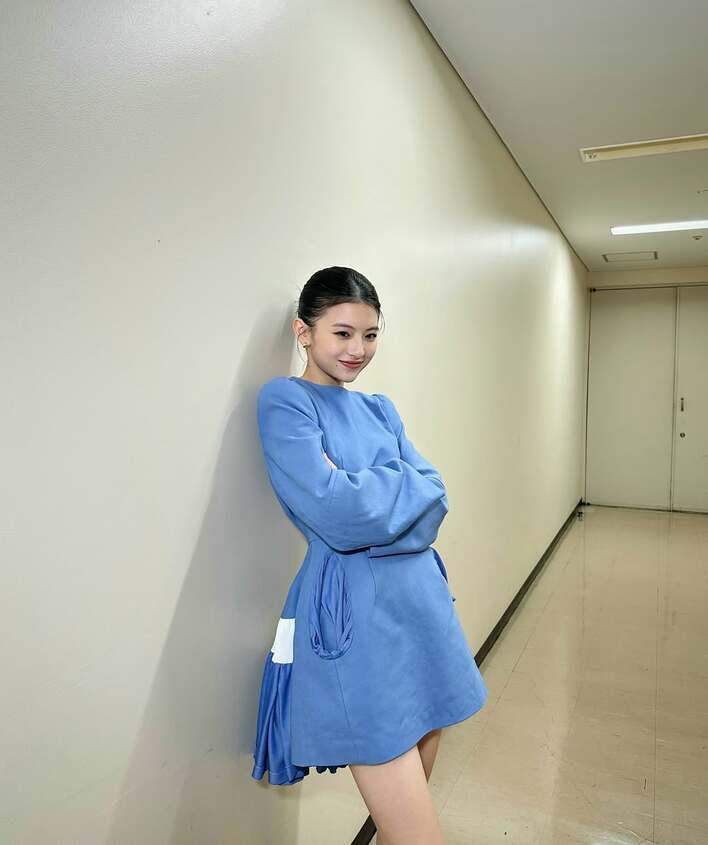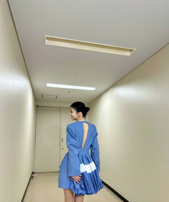 ブルーのミニ丈ドレスに身を包み、すらっと伸びた“美脚”を披露しています。ヘアスタイルはビシッとまとめて、にっこり笑顔。