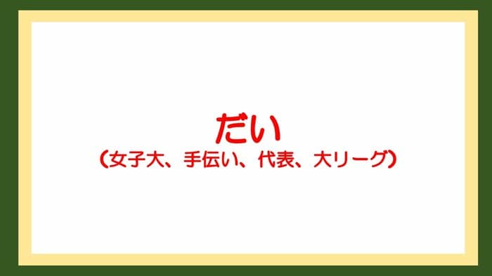 正解は、「だい(女子大、手伝い、代表、大リーグ)」。
