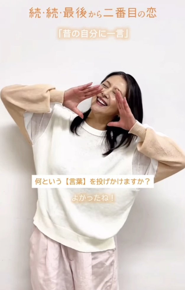 続けて、「私はまだまだ元気だし、(中井)貴一さんもカッコいいし、視聴者の皆さんも楽しんでくれてるよ!よかったね!」と、昔の自分にヤッホーポーズでおちゃめに呼びかけ、カメラに向かって笑顔で手を振りました。