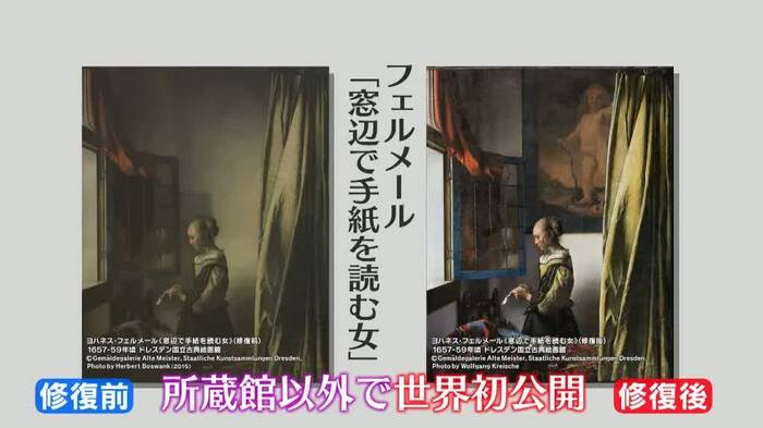17世紀オランダを代表する画家ヨハネス・フェルメールの初期の傑作「窓辺で手紙を読む女」は、1979年の調査で背後の壁にキューピッドの画中画が描かれていることが判明。その後塗りつぶされた上塗りはフェルメール死後に何者かによって行われたことが明らかになり、上塗りの除去作業を実施した。今回、修復後初めて所蔵館であるドレスデン国立古典絵画展以外で公開されることになった。