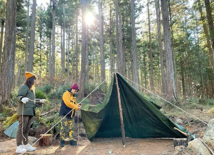 使うのは山にある枝と石、防水シートに麻縄だけ。工夫次第で快適なテントができあがる。