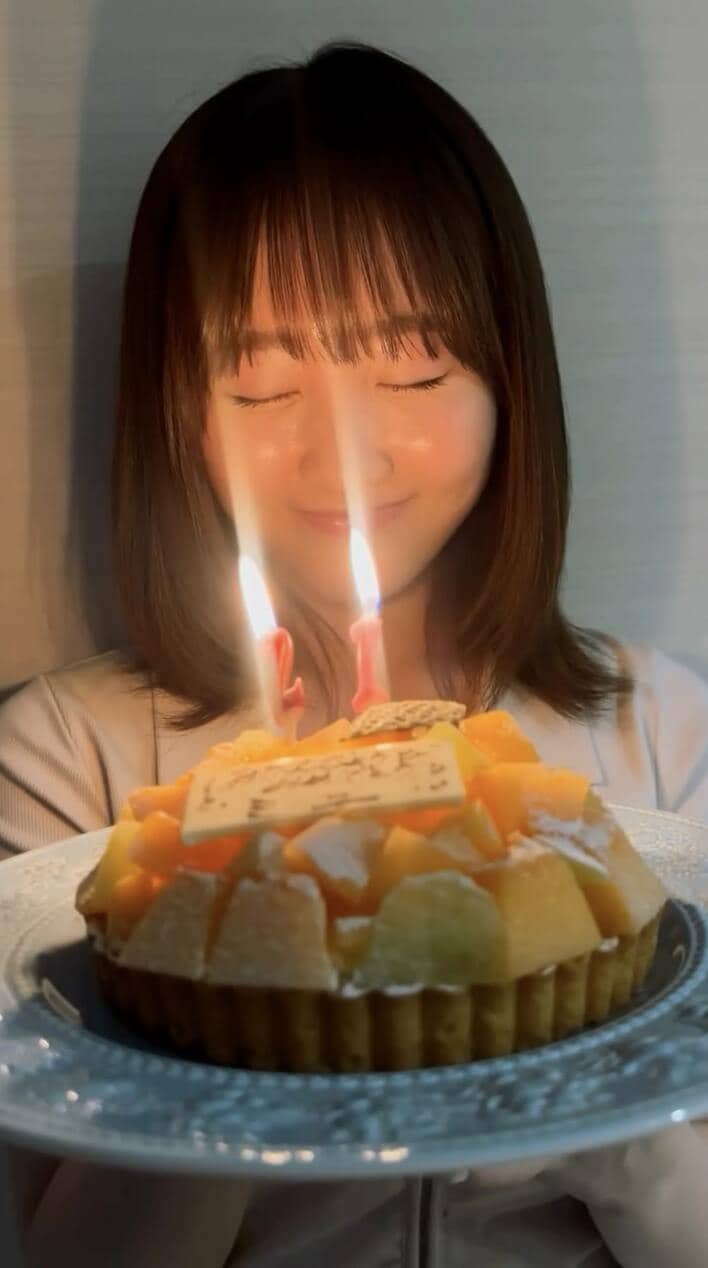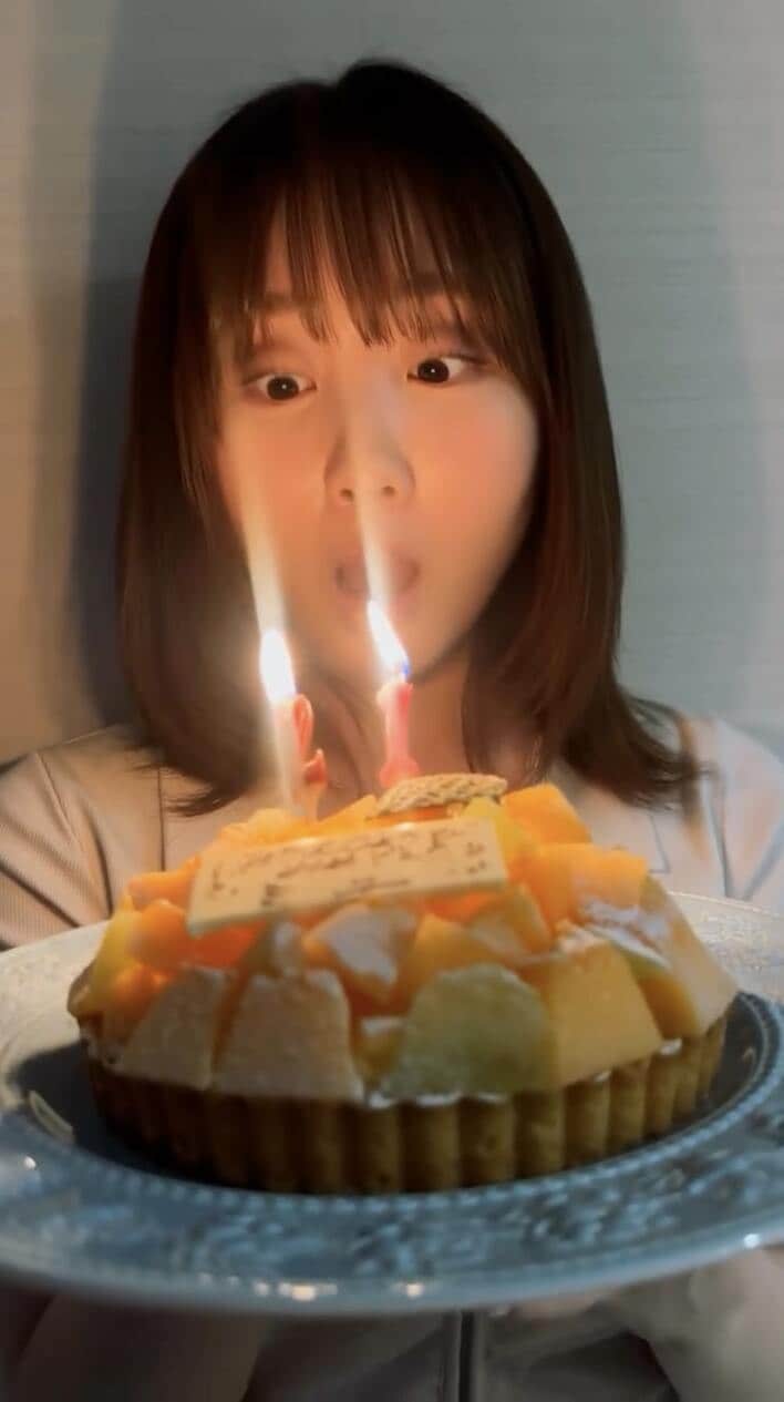 動画を見ると、メロンがふんだんにのったタルトのケーキを持つ姿が。数字の「21」のろうそくには火がついていて、消す前に願い事をしているのでしょうか、にっこりしながら目を閉じています。