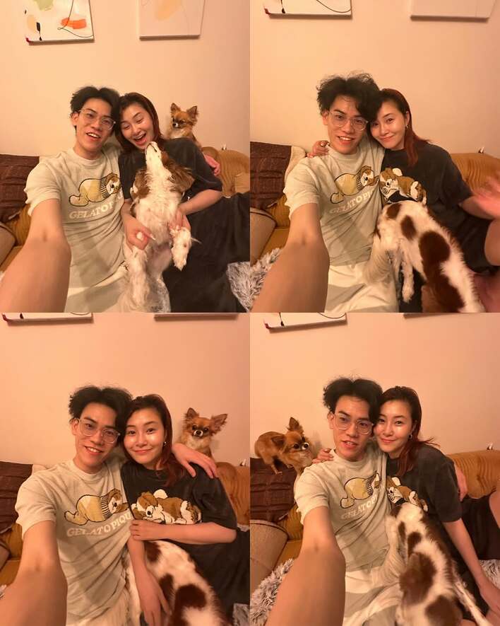 村上さんが抱きながら見つめ合っているのが、キャバリアのViViちゃん。茶色×白の顔周りの模様が、今回村上さんがジェラートピケで見つけたと明かしていた通り、夫婦で着用しているアイテムの子犬の絵柄とそっくり!