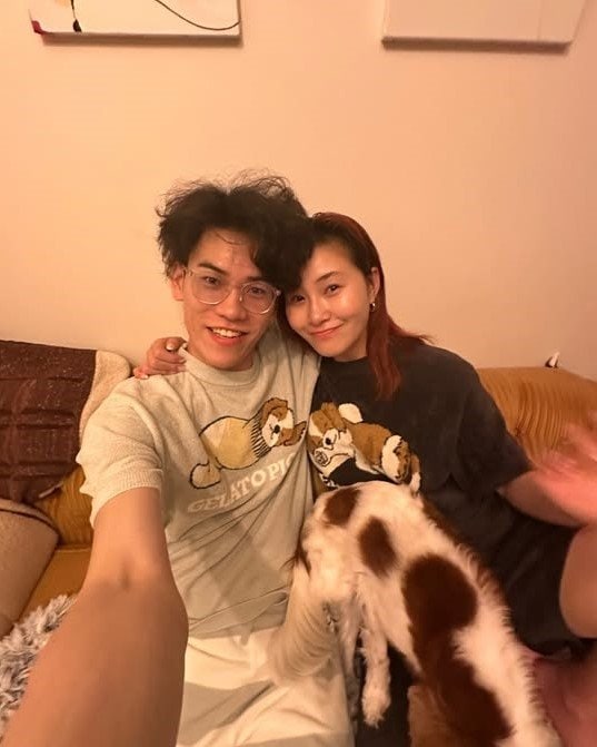 また、村上さんはダークグレー、旦那さんはミントカラーのセットアップアイテムを身に着けています。それぞれの胸元には、スヤスヤとくつろぐ子犬が描かれていて、仲良く夫婦でシミラールック♪