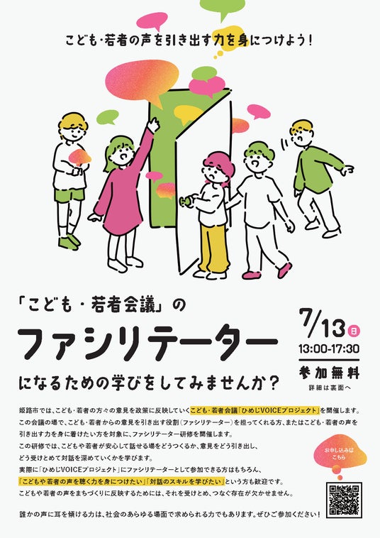 あわせて、この会議の場で、こども・若者からの意見を引き出す役割(ファシリテーター)を担ってくれる方、またはこども・若者の声を引き出す力を身に着けたい方を対象に、ファシリテーター研修を開催します。