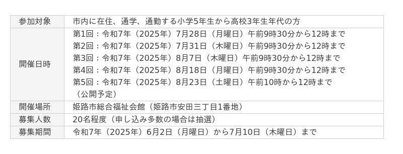 こうした状況を踏まえ、こども・若者の意見を聴くことを通じて、こども・若者の現状やニーズを把握し、施策の実効性を向上させるとともに、こども・若者の自己肯定感や市政に対する関心を高め、こども・若者のウェルビーイングの向上を目的として、こども・若者会議「ひめじVOICEプロジェクト」を開催します。