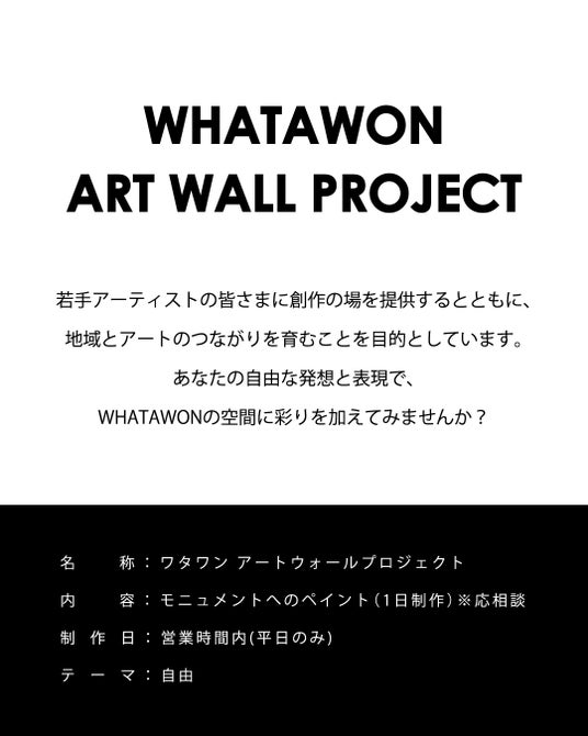 名称:WHATAWON ART WALL PROJECT(ワタワン アートウォールプロジェクト)内容:モニュメントへのペイント制作(1日制作予定)※応相談