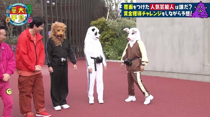 博多華丸さん、博多大吉さん、千鳥(大悟さん、ノブさん)、かまいたち(山内健司さん、濱家隆一さん)が、動物のマスクを被った有名人ゲスト=“覆面さん”たちとさまざまなゲームにチャレンジしながら、有名人の正体を予想しました。