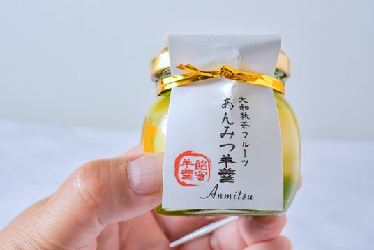 歴史ある「大和茶」を使ったフルーツあんみつ羊羹。最下層に甘さ控えめの大和抹茶の羊羹。中層には、4種類のフルーツ(白桃・黄桃・みかん・パイナップル)をかんてん羊羹(錦玉羹)で寄せ固めました。最上部には、濃厚で苦み・旨味の効いた大和抹茶みつをかけています。抹茶みつ、フルーツ、羊羹の味の調和が絶妙な一品!見た目にもきれいで、涼しげなスイーツです。