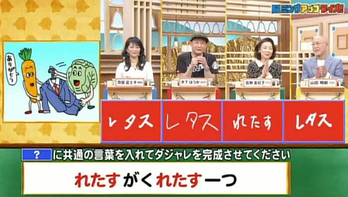 正解は「れたす(レタスがくれたスーツ)」。見事に全員正解!