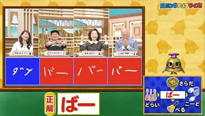 正解は「ばー(ドライバー・サラダバー・バーコード・バーベル)」。木下、音無、山田の3人が正解。