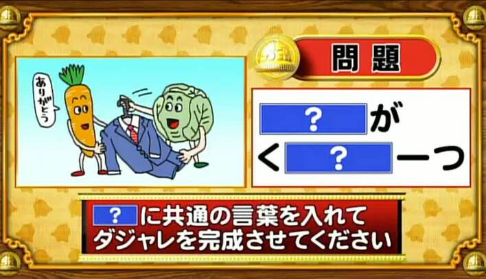 最初は「脳ミングアップクイズ」から、ダジャレ穴埋めの問題。「?」に共通する言葉を入れてダジャレを完成させよ。