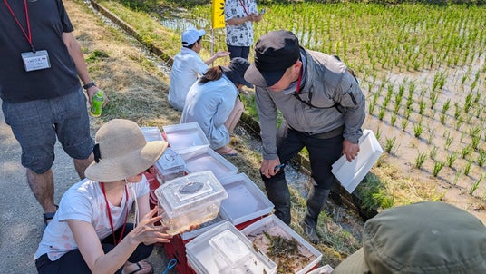 草取りの後は見通しの良くなった田んぼで、どんな生き物が住んでいるのか探します。生き物の種類や名前、数を調査して、環境保全型農業で育まれる多様な命の存在を確認します。普段食べている米を育む水田に生息する生き物を知り、地域の環境と調和した米作りの意味を考えます。