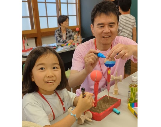 地域の交流施設「旧長井小学校第一校舎」では、オリジナルけん玉作りを体験します。ペインティングを施して世界に一つのけん玉を制作します。けん玉のプロが高難度な技を披露するパフォーマンスも予定します。