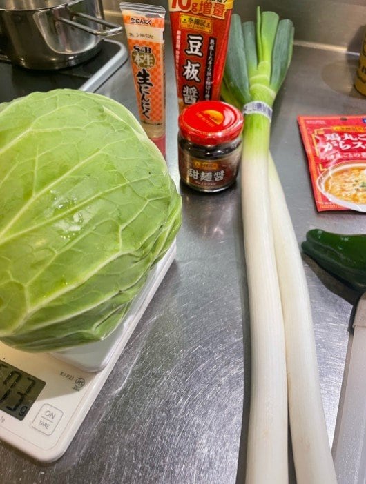 キャベツ、長ねぎ、ピーマンと野菜を用意。