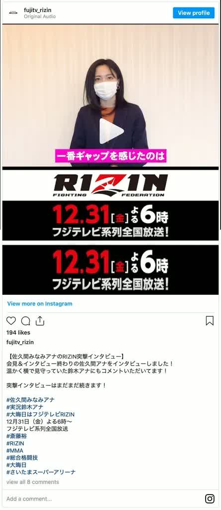 「フジテレビRIZIN」公式Instagramでは、佐久間アナが選手たちについて勉強している様子や、選手や出演者たちを直撃インタビューしている様子も配信中。先輩の鈴木芳彦アナウンサーの背中を追いかけ奮闘する佐久間アナから目が離せない!