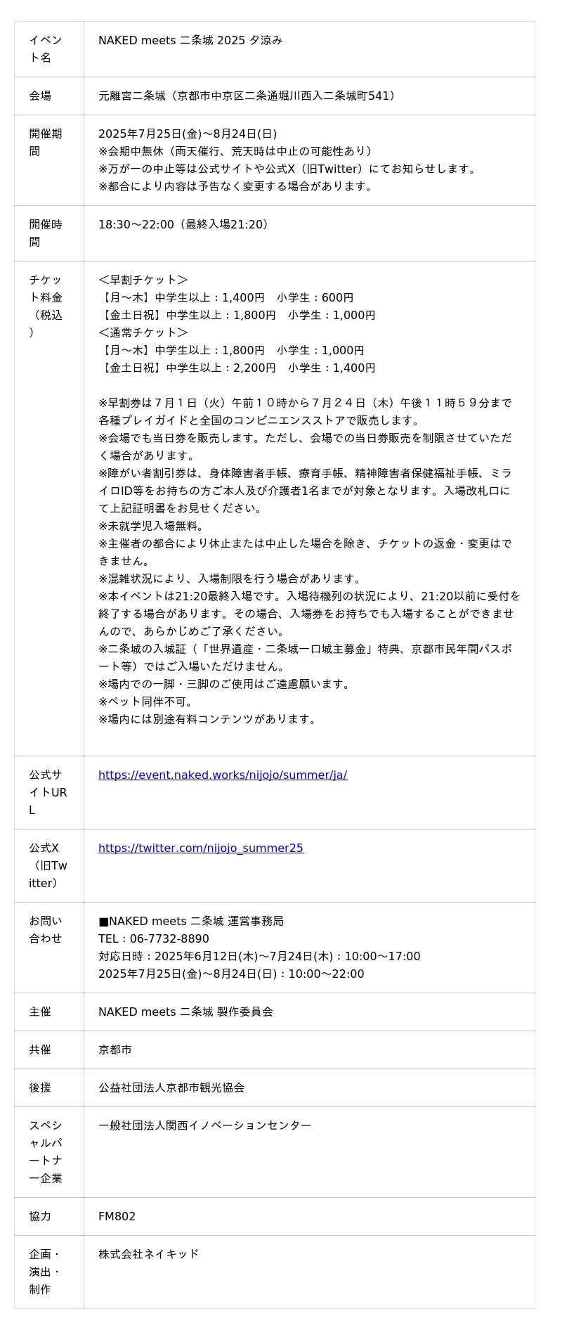 『NAKED meets 二条城 2025 夕涼み』開催概要