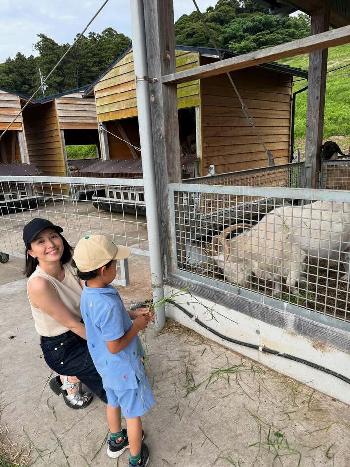 大きな山羊の前でほほ笑む橋本さんの隣には、山羊をジーっと見つめる4歳の息子さんが。餌の葉っぱを手に持つ息子さんは、青色のセットアップを着たかわいらしいコーディネート。橋本さんは、ノースリーブのトップスにジーンズ、足元は歩きやすそうなサンダルを合わせています。