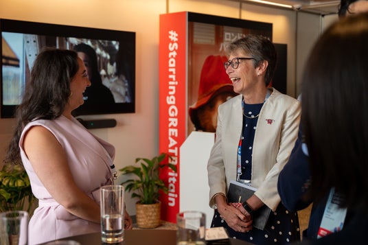 2025年大阪・関西万博「UKツーリズムデー」にて、キャロリン・デイビッドソン 2025年大阪・関西万博 英国政府代表とレベッカ・アブラハムズ - マーケティング・マンチェスターが歓談