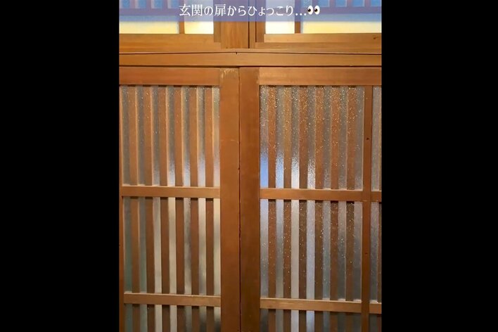 江端家の、締めきった玄関扉から始まるこの動画。その扉の向こうには“白い影”が。少しすると扉が遠慮気味に開き、本田さんが片目で中を覗き込んできます。