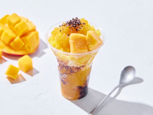 夏のカラー、太陽をイメージした情熱的な印象をまとったプリンチオリジナルのグラニータ。マンゴーピューレと甘酸っぱいパッションフルーツのピューレに、パッションフルーツのシロップを合わせた南国のフルーツテイストです。マンゴージュレが放つぷるっとした食感に、パッションフルーツの甘酸っぱいソースが合わさり、とろっとしたマンゴー果肉を頬張ることで最後まで心地のよいトロピカルなリゾート気分に。チョコレートソースでカップにらせん状にマーブル模様を描き美しいアクセントに。トッピングのカカオニブがもつ心地よい食感が優雅な味わいを添えます。