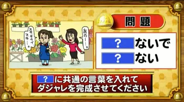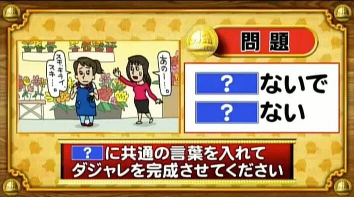 最初は「脳ミングアップクイズ」から、ダジャレ穴埋めの問題。「?」に共通する言葉を入れてダジャレを完成させよ。