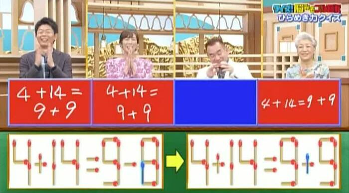 正解は、まず、右の式の「8」から1本を動かし「9」にする。その1本を同じ式の「-」に足して「+」にする。そうすれば「4+14=9+9」となる。島田、大林、中尾の3人が見事正解!