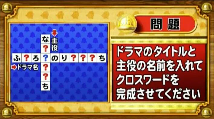 最初は「脳ミングアップクイズ」から、ドラマ・主役クロスワードの問題。ドラマのタイトルと主役の名前を入れてクロスワードを完成させよ。