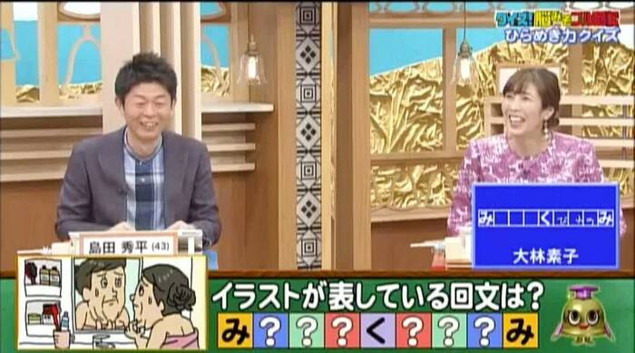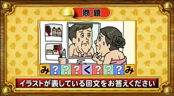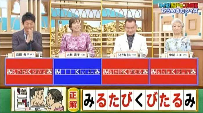 正解は「みるたびくびたるみ(見るたび首たるみ)」。島田、ふとがね、中尾の3人が正解。