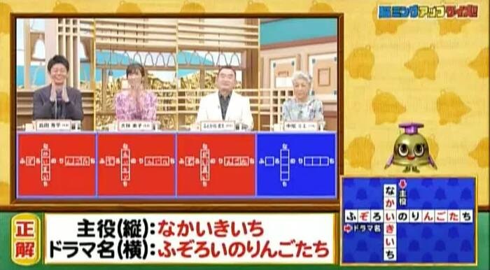 正解は「ふぞろいのりんごたち(ふぞろいの林檎たち)」と「なかいきいち(中井貴一)」。島田、大林、ふとがねの3人が正解!