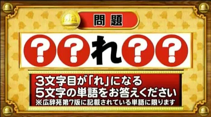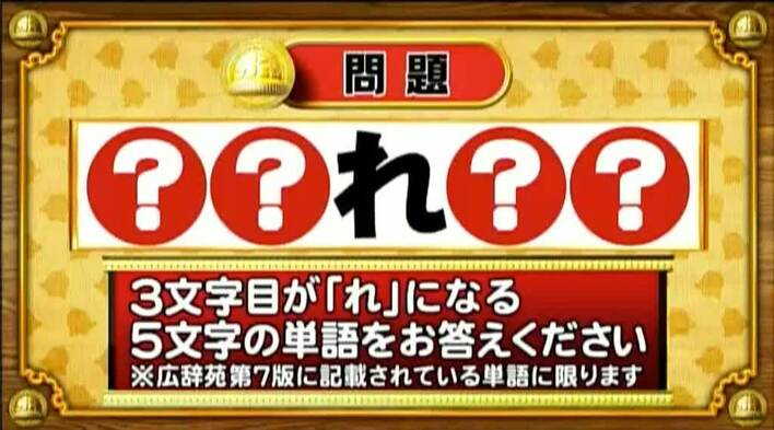 最初は「脳ミングアップクイズ」から、指令単語の問題。3文字目が「れ」になる5文字の単語を答えよ。