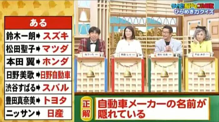 正解は「自動車メーカーの名前が隠れている」。ねづっち、斉藤、野村の3人が正解!